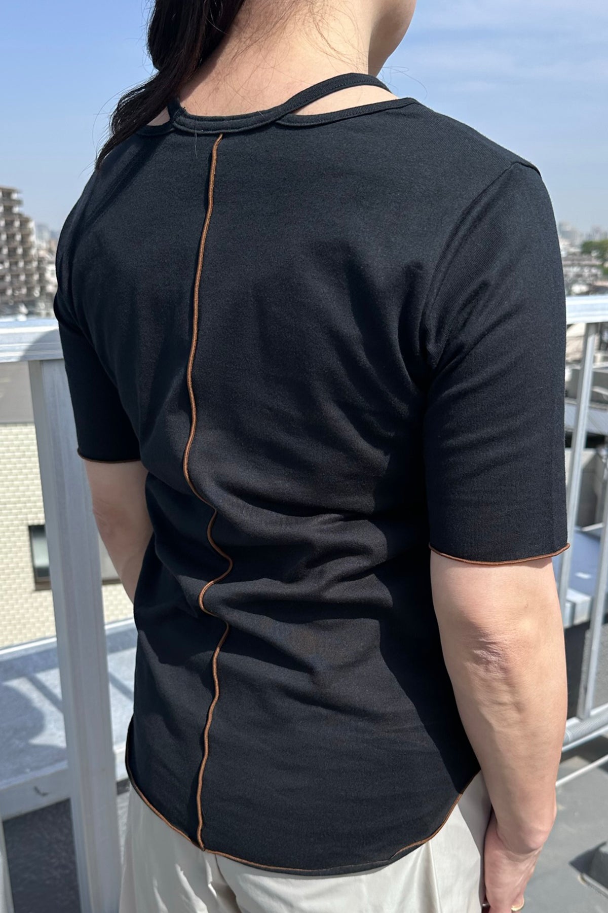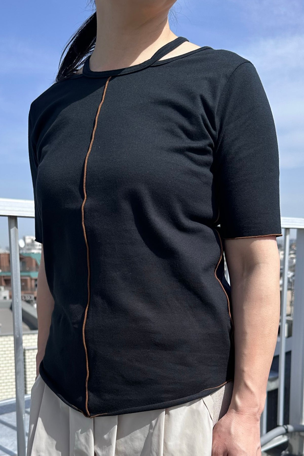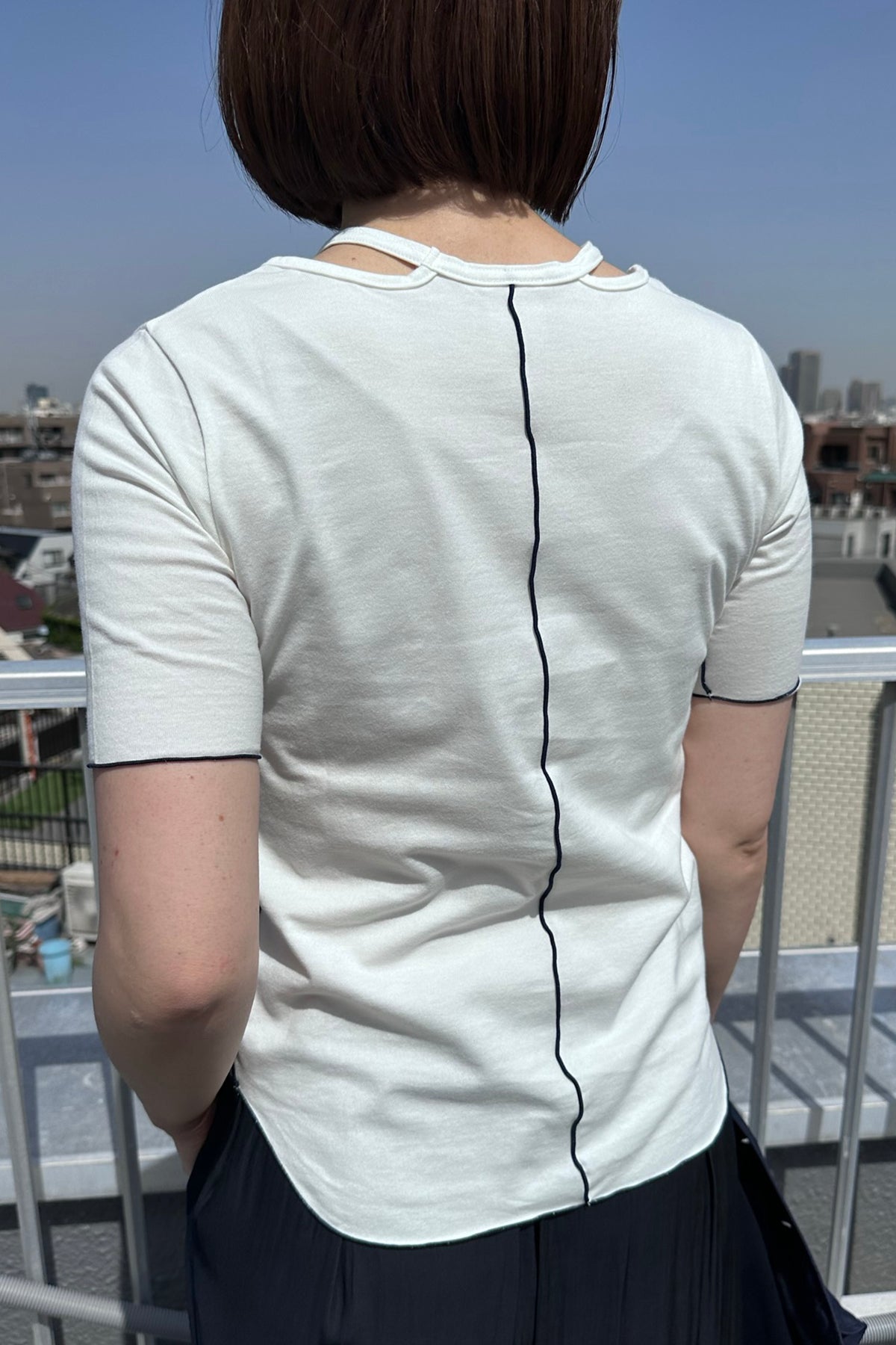 衿まわりにデザインがあるジャストサイズの半袖Tシャツです。