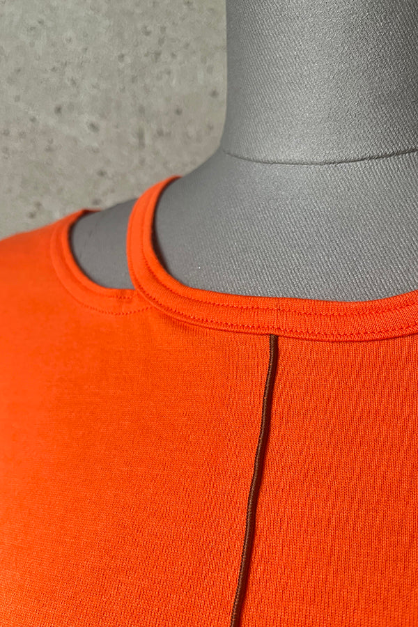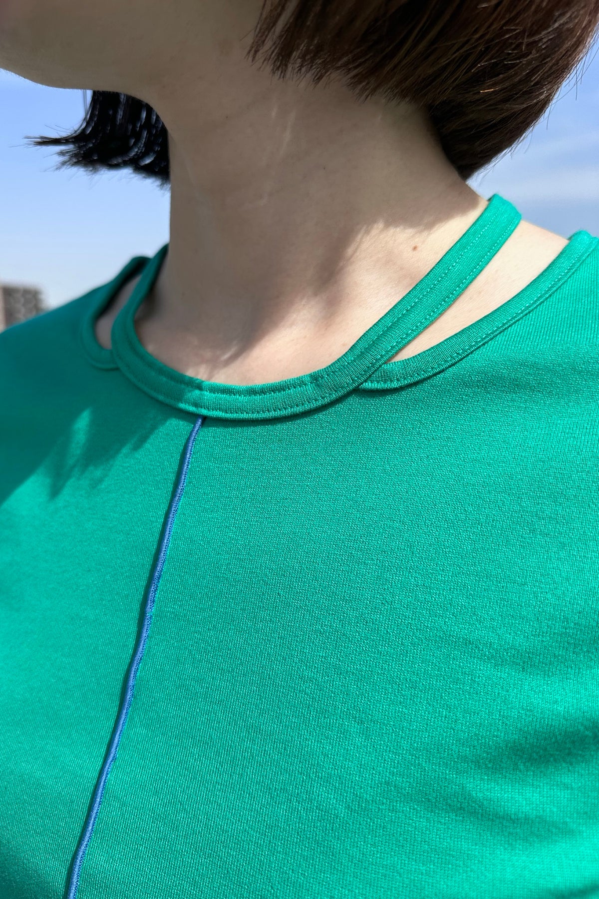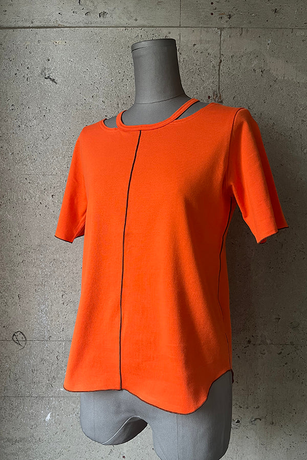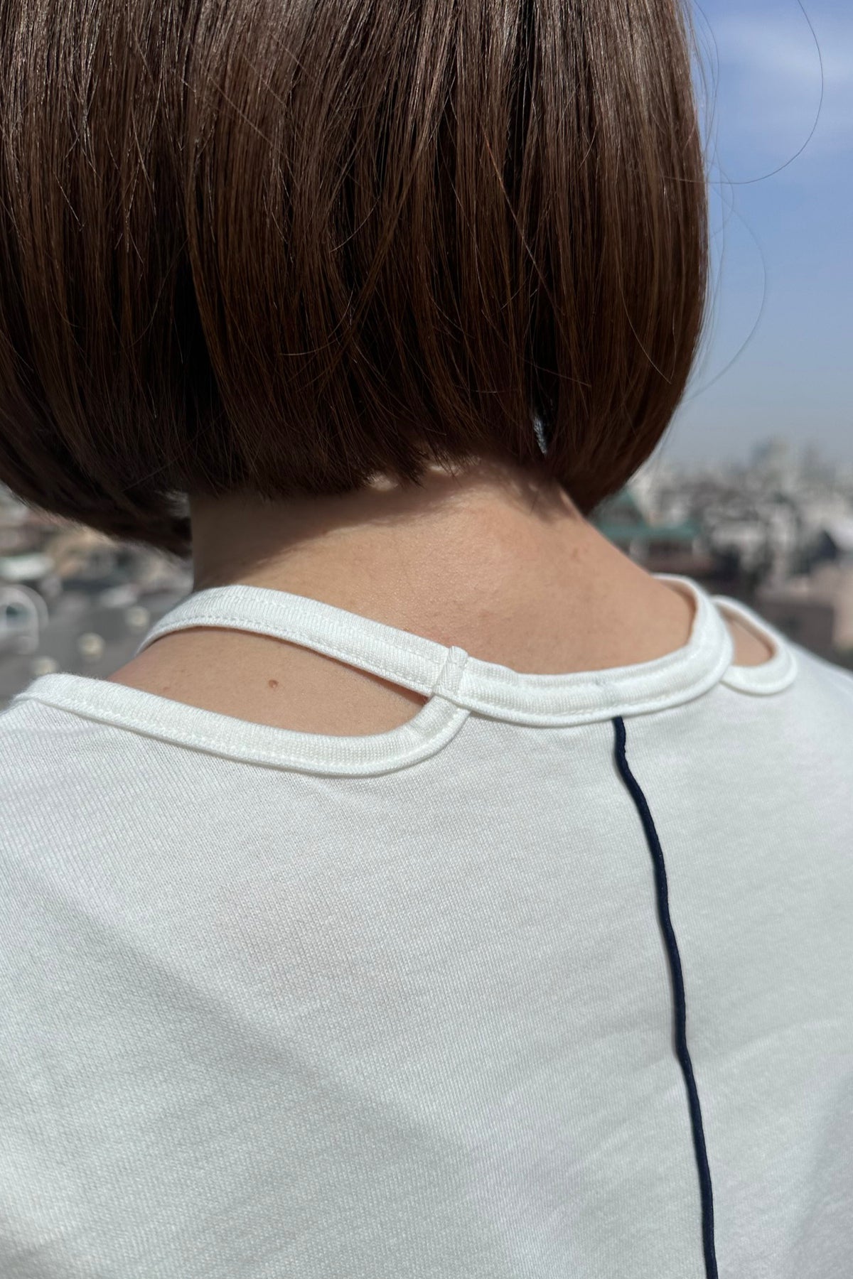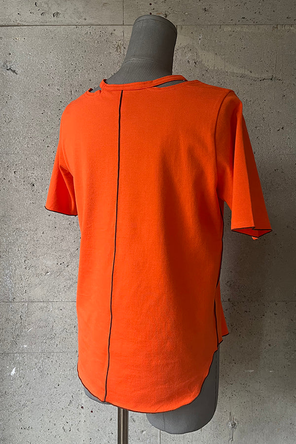 衿まわりにデザインがあるジャストサイズの半袖Tシャツです。