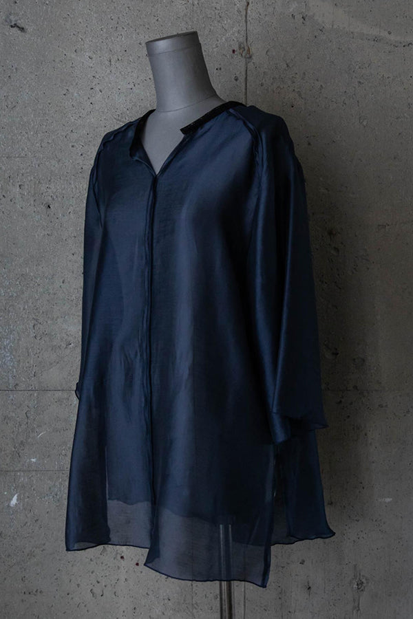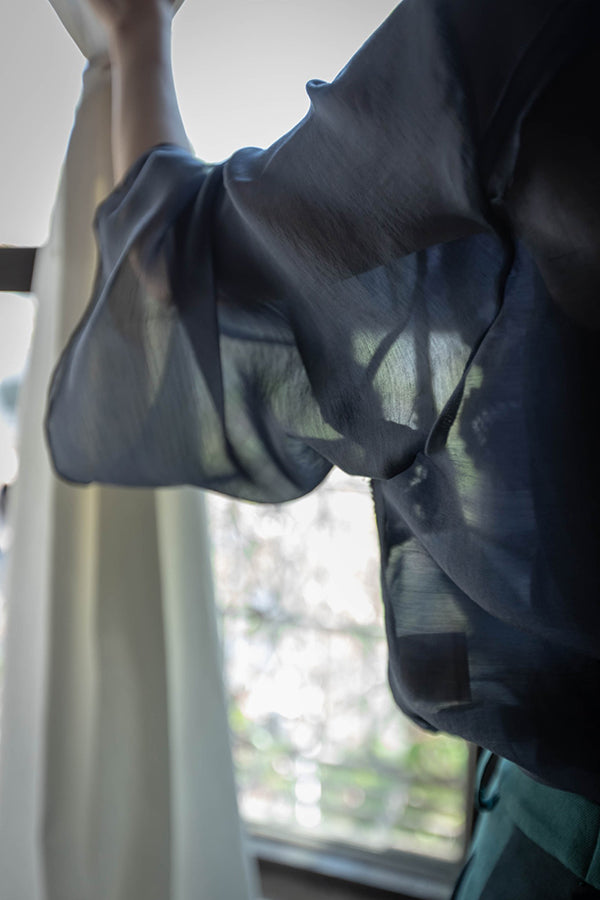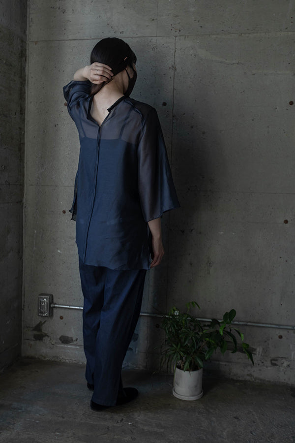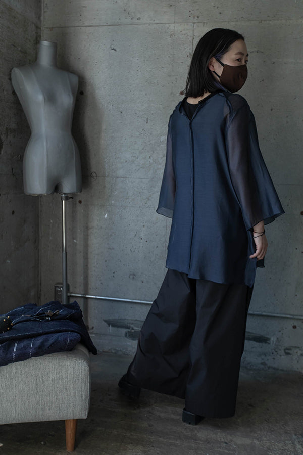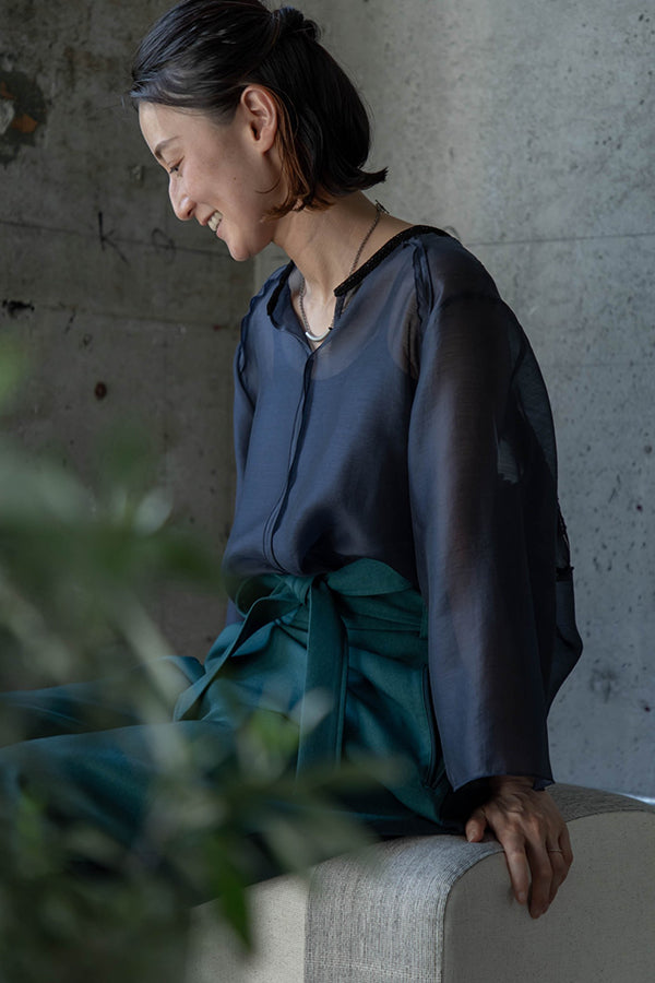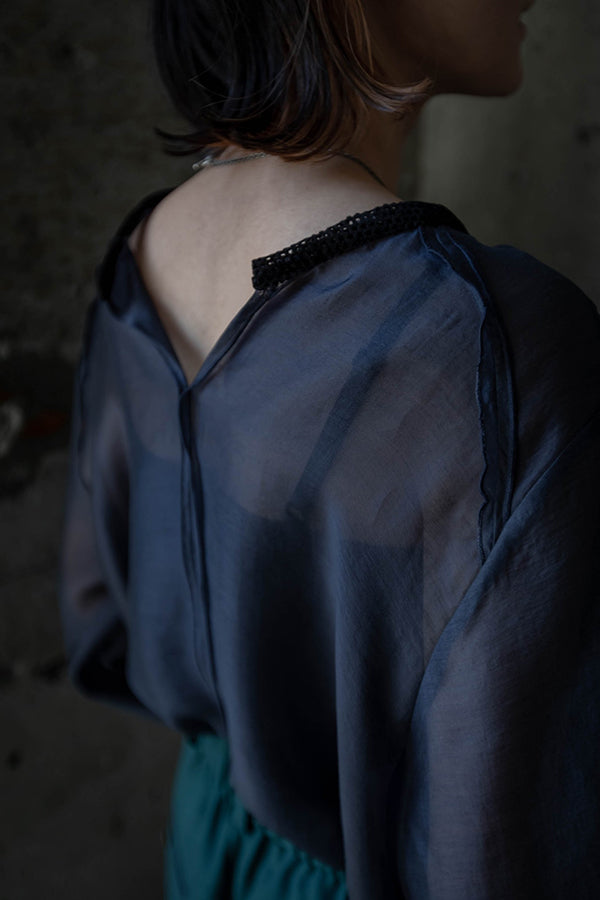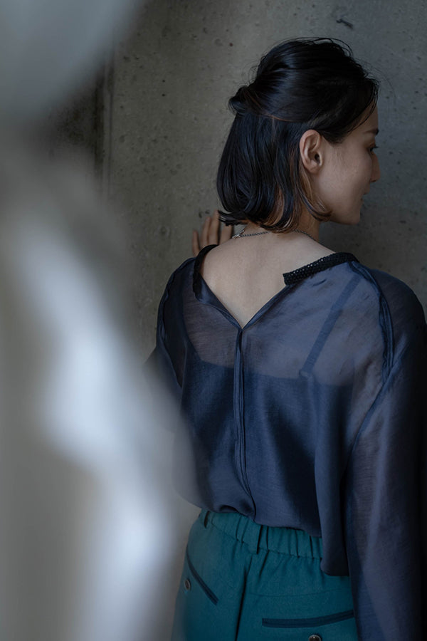 暑い日も、難しい季節の変わり目にも重ね着して着れる、ダークトーンのシアーブラウス。