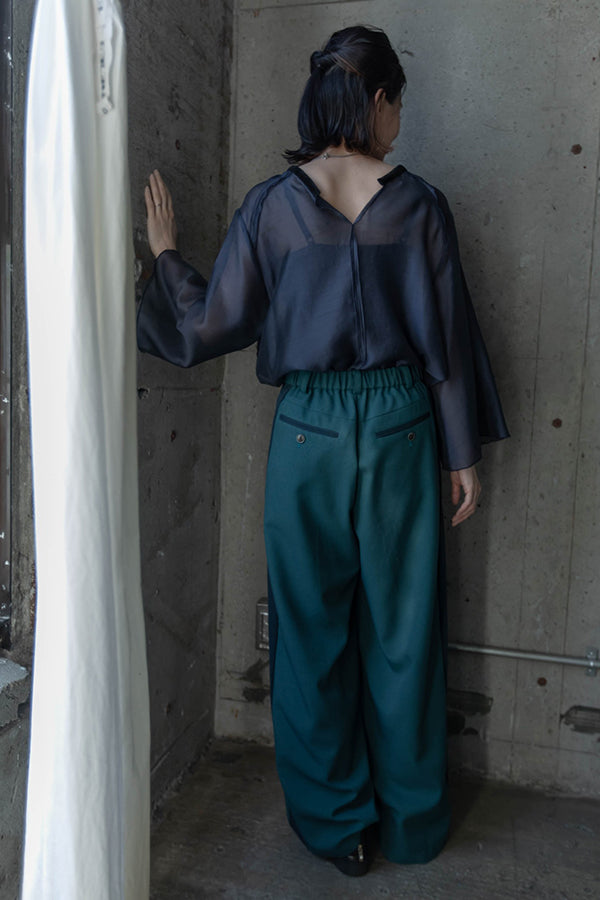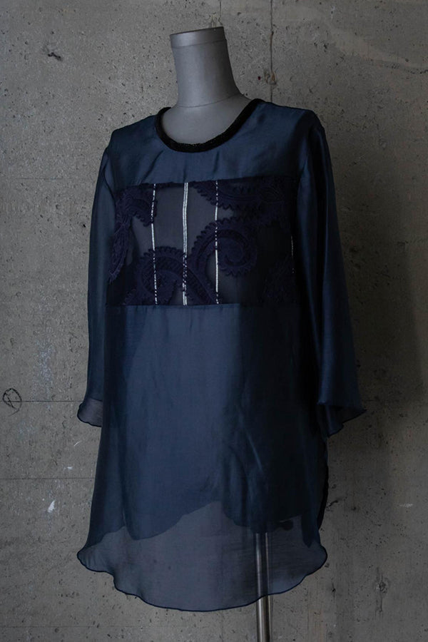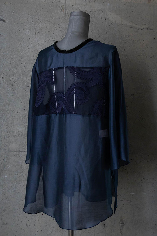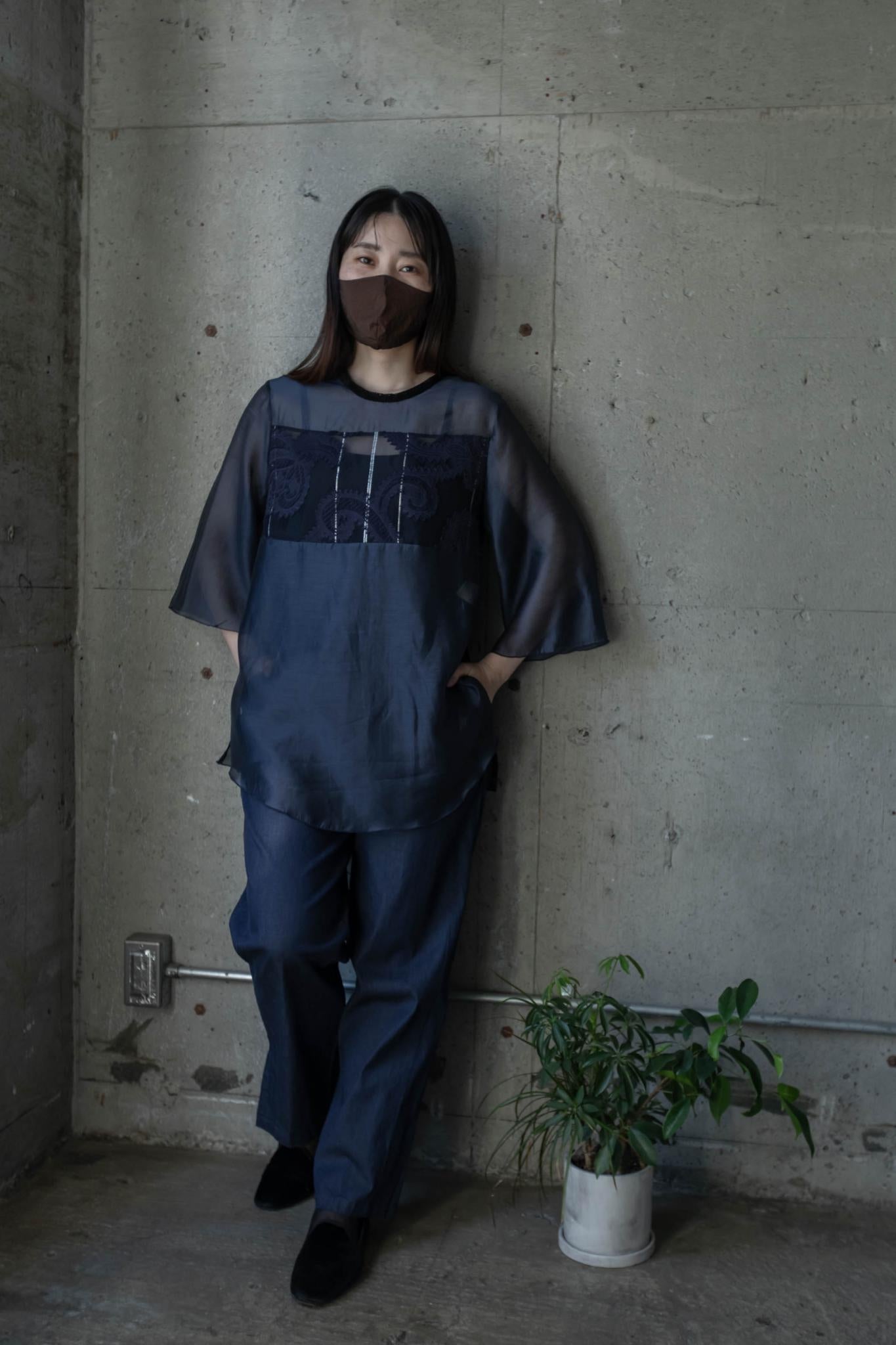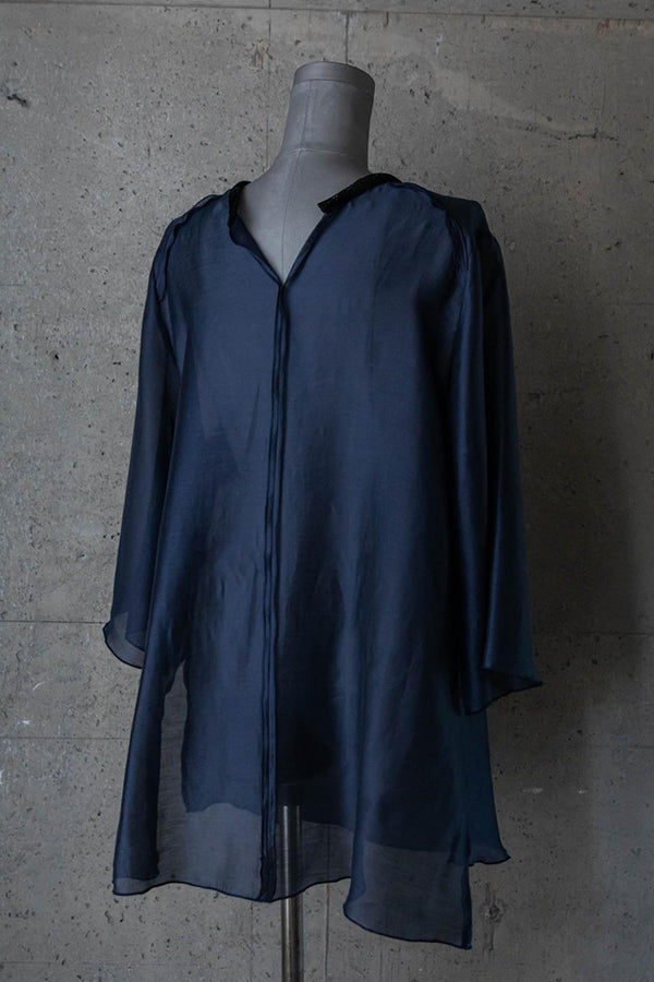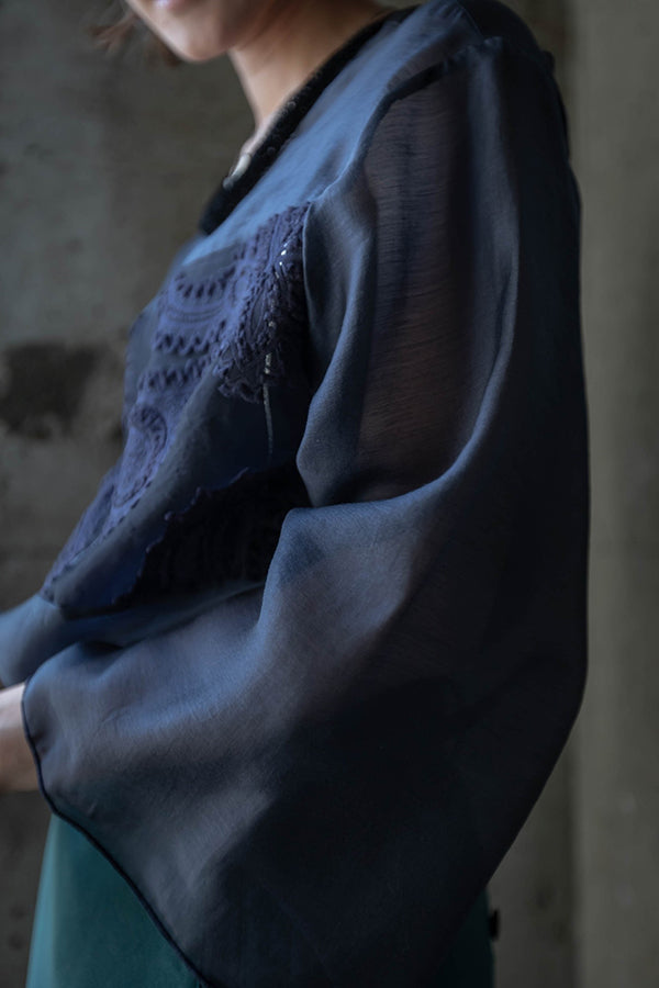 暑い日も、難しい季節の変わり目にも重ね着して着れる、ダークトーンのシアーブラウス。