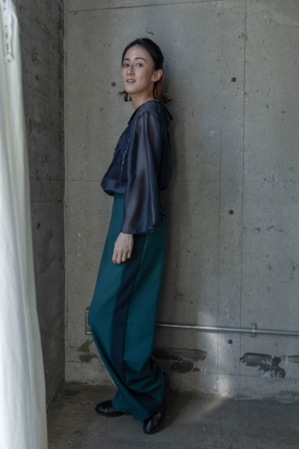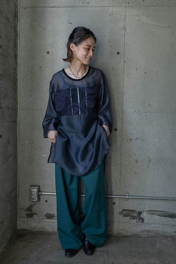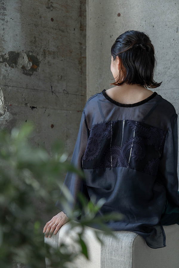 オリジナルのペイズリージャカード生地をあしらった、他にはないブラウス。ベースの透けた生地も、光沢がありとても滑らかな肌さわり。