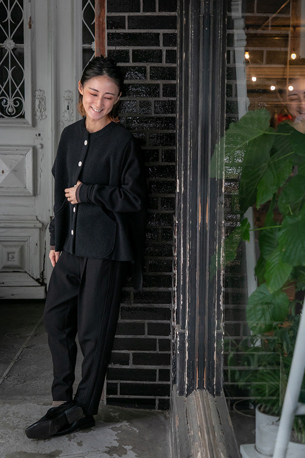 シンプルなクルーネックに、大きいボタンがポイント。