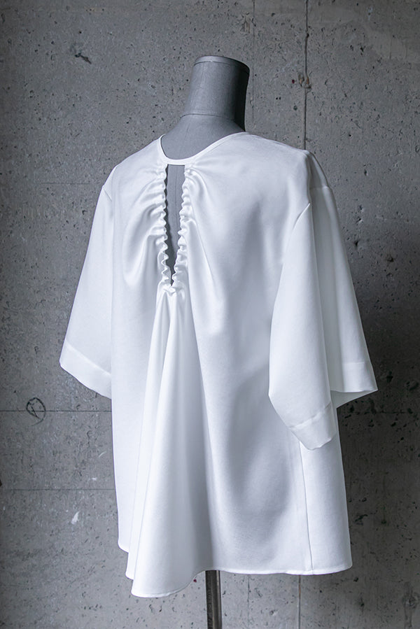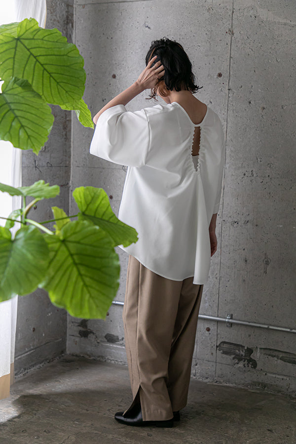 バックスタイルはスリット明きのギャザーデザインがポイントに。