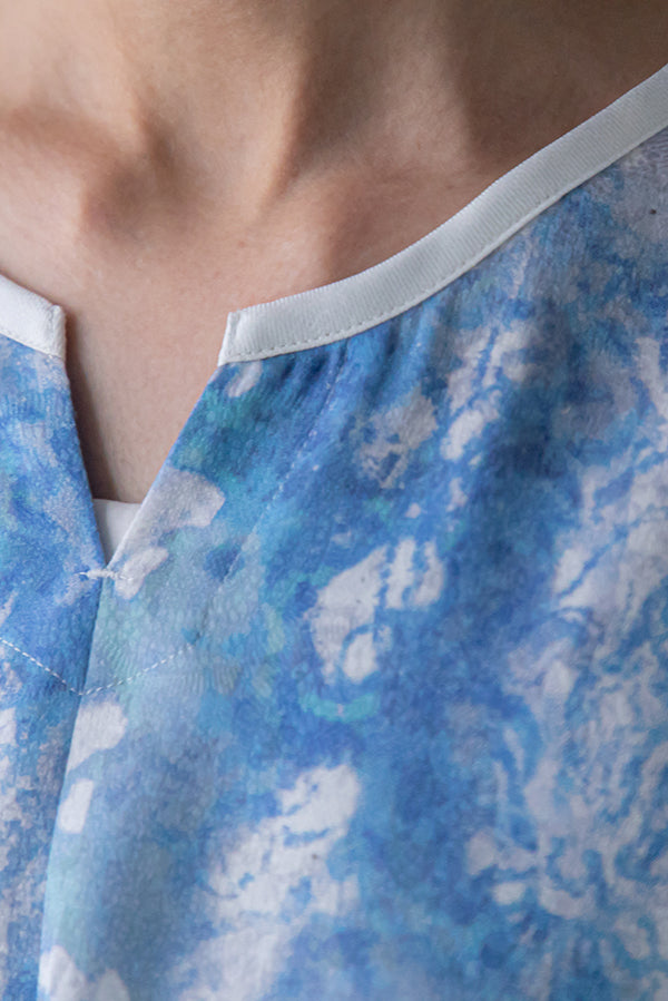 ブルーの木漏れ日プリントが印象的な、爽やかなブラウス。
