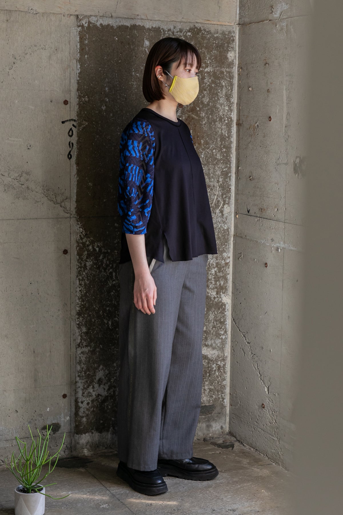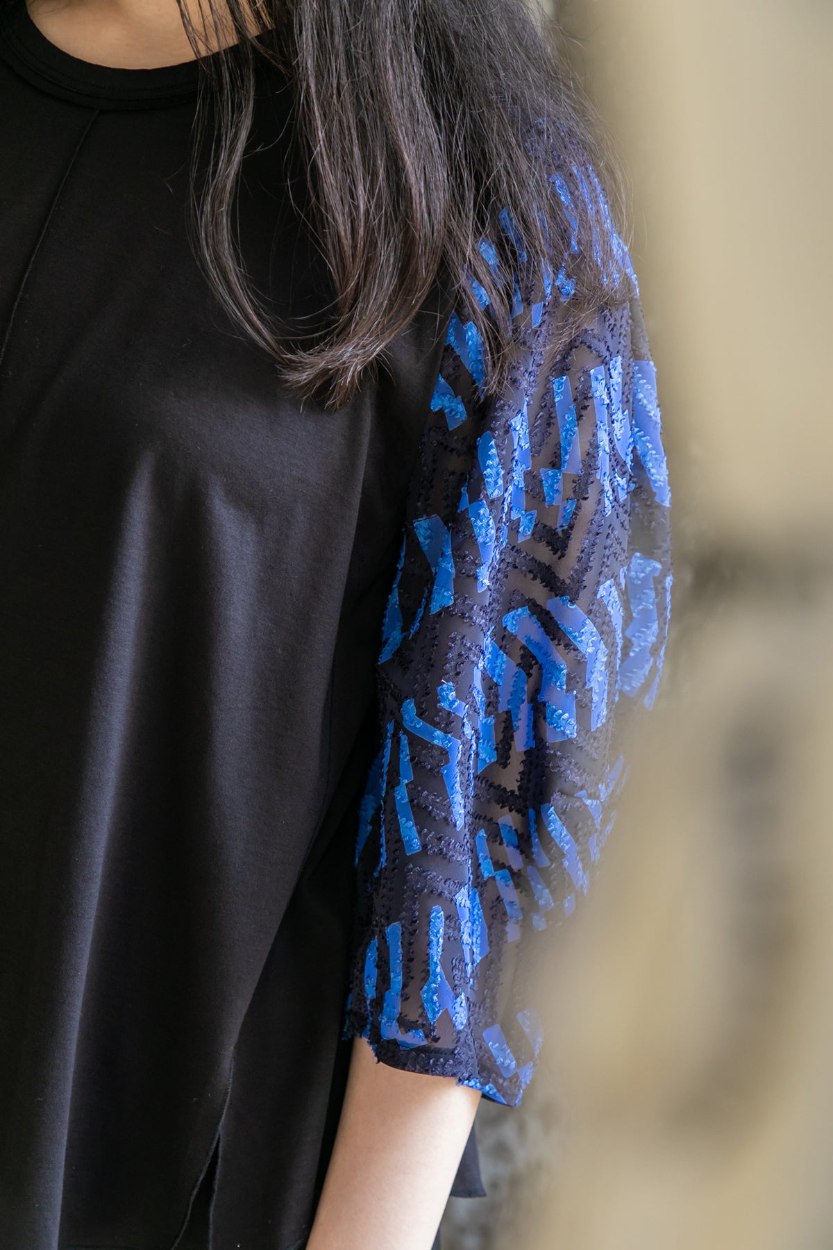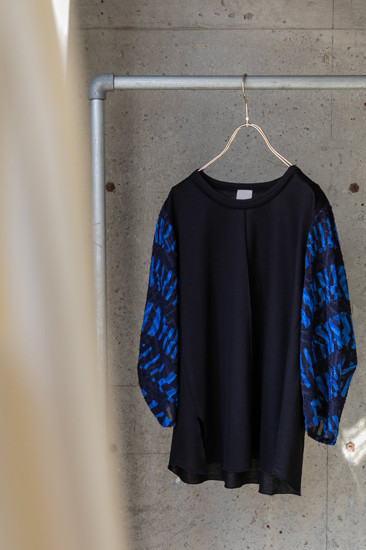 カットジャカードという、特殊なジャカード生地に、オリジナルのプリントを施した一枚。ブルーとネイビーの色合いが印象的。