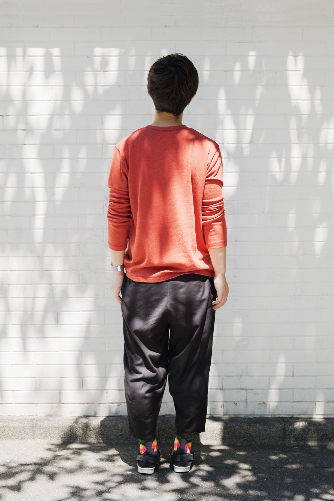 女性でも鎖骨が少し覗くくらいの、開きすぎない首回りは、ほんの少しきちんとした印象になり、 大人が着られるTシャツです。